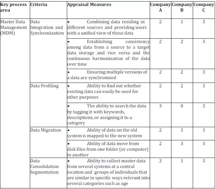 Table 4 depicts the capabilities levels among three companies in master data management perspective. The overall score for company A, B and C is 3.13,1.67 and 3 respectively. Company B is lowest capacities among company A and B.