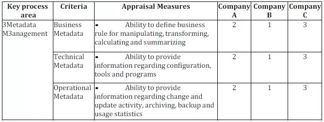 Table 5 depicts the capabilities levels among three companies in metadata management perspective. The overall score for company A, B and C is 2,1 and 3 respectively. Company B is lowest capacities among company A and B.