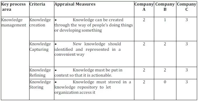 Table 6 depicts the capabilities levels among three companies in knowledge management perspective. The overall score for company A, B and C is 2, 1.25 and 3 respectively. Company B is lowest capacities among company A and B in knowledge management perspective.