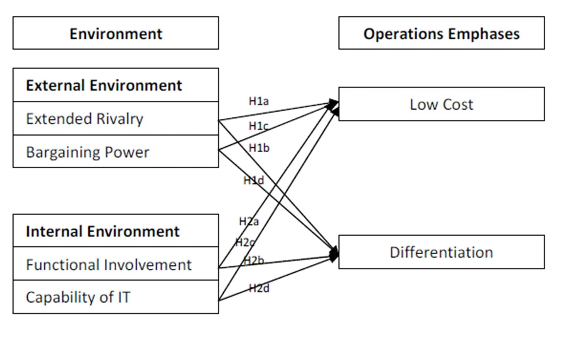 Porter’s five forces is established since 1980 in Porter’s classic text book Competitive Strategy and has been applied in IO analysis to business strategy (Spulber, 2003). The five forces analysis is considered still valid and used to indicate several possible competitive strategies to successfully compete within the industry (Hopkins, 2008). While Porter (1980) categorized environment analysis into five forces, this study aggregates the five forces into two major categories (variables) following that of Narayanan and Fahey (2005). The two variables are extended rivalry (potential/new entrants, substitutes and rivalry) and bargaining power (customer and supplier). With respect to business strategy, Huo et al. (2008) suggested two dimensions of operations emphases namely low cost emphasis and differentiation emphasis. Low cost emphasis is defined as a company competing by being the lowest cost service provider (Huo et al., 2008). Differentiation emphasis is defined as a company differentiating its services from its competitors’ services in areas such as quality, speed and flexibility while cost is not the major strategic focus (Huo et al., 2008). Therefore, the hypotheses are: