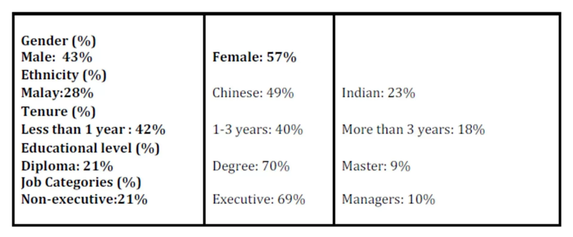In total, 350 self reported questionnaires were distributed at various service organisations around the Kuala Lumpur and Selangor area. These organisations are known to employ a majority of generation Y employees, such as: the business process outsourcing sector, hospitality sector, health sector and etc.