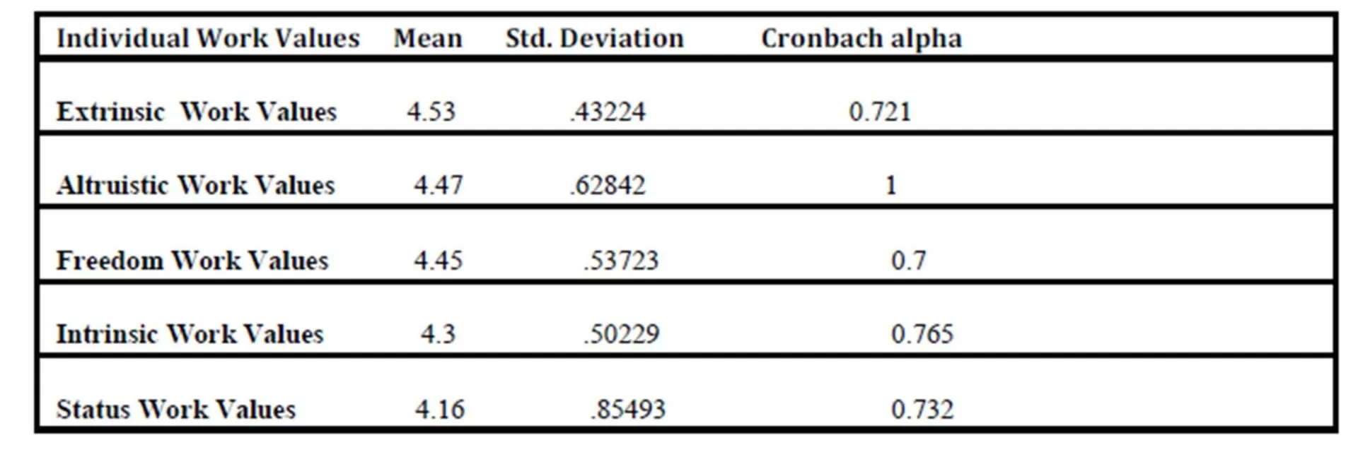 Thereafter, reliability of the constructs is assessed to ensure the internal consistency of the respondents. Subsequently, descriptive analysis was performed to rank the preferred work values according to respondents’ perceptions; the ranking is based on the mean score.