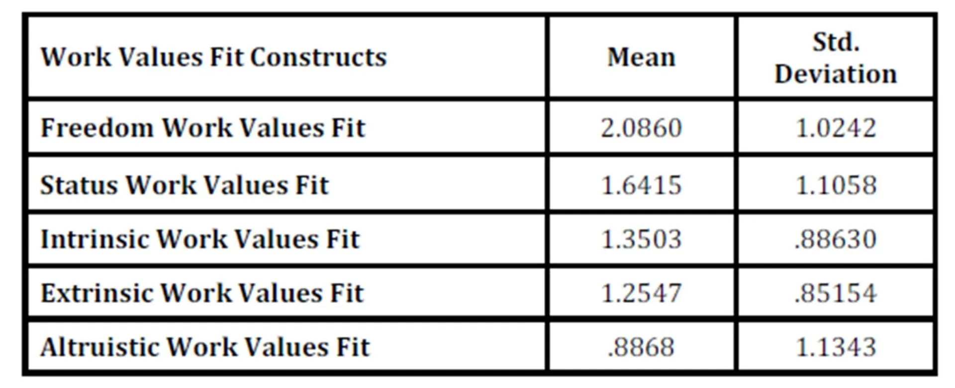 The discrepancies scores (D score) between the individual form and organizational form represent the measure of fit. Hence, organizational work values factors are subtracted from individual work values factors to create discrepancies scores, or fit composite. Table 4 provides the discrepancies scores that constitute the fit composites.