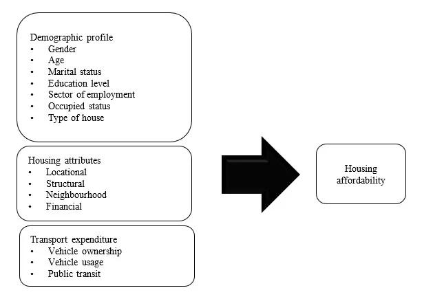 In this present study, five independent variables (location, neighborhood, structural, financial, and transportation expenditure) and one dependent variable (housing affordability) were examined. The conceptual framework for this study was shown in Figure 1 showing the interrelationships between the independent variables and the dependent variable.
