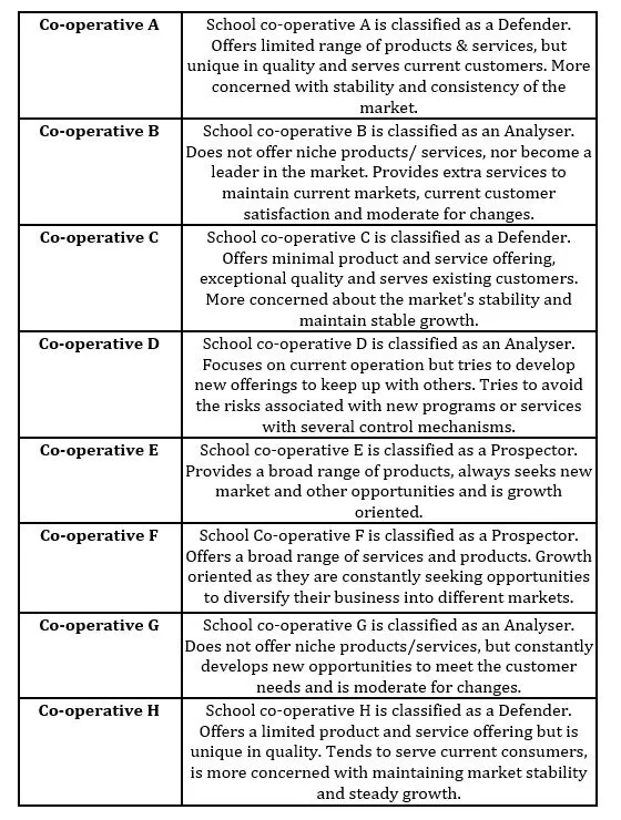Based on the data gathered, the strategy pursued by eight selected school co-operatives can be determined by using Miles and Snow’s (1978) typology. This is supported by Japelus et al (2017) who stated that Miles and Snow’s (1978) typology is the most appropriate to determine the strategy adopted by co-operatives. There are four major co-operative strategy principles used for this study: prospector, defender, analyser and reactor (Miles and Snow 1978). The business strategy pursued by eight (8) school co-operatives was grouped according to the four major co-operatives strategy principles is presented in Table 3.