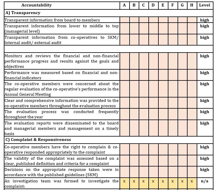 Consequently, based on the findings above, all eight co-operatives have indirectly applied the suggested indicators by Japelus et al (2017) and Blagescu et al. (2005). Hence, the four indicators (i) transparency, (ii) evaluation, (iii) complaint and responsiveness, and (iv) participations were suitable to determine the measurement for accountability of co-operatives and it is parallel to the definition of accountability in this study.