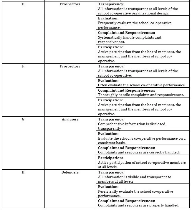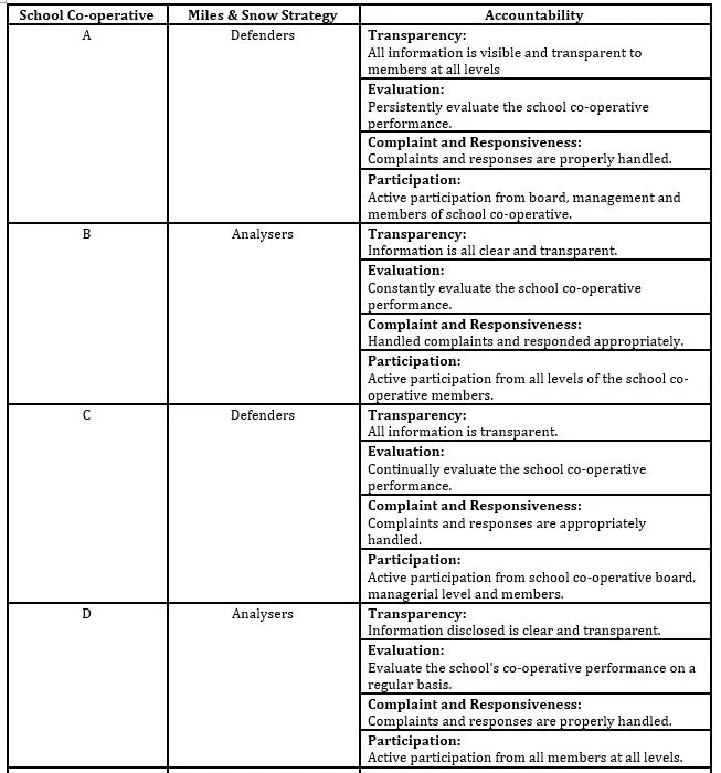 Hence, based on the findings, it can be concluded that school co-operatives which have been classified as Prospectors, Analysers and Defenders have high accountability level. School co-operatives E and F have been classified as Prospectors and have high accountability level. Similar to school co-operatives A, C and H which are classified as Defenders and, have high accountability level, and school co-operatives B, D and G which are classified as Analyzers, have high accountability level. This is in parallel with the first, second and third research propositions as this study anticipate that co-operatives classified as Prospectors, Analysers and Defenders will have high accountability level. None of the co-operatives selected were categorized as Reactor. Therefore, there is a connection between strategy and accountability level in co-operatives.