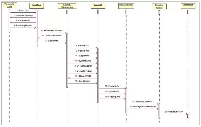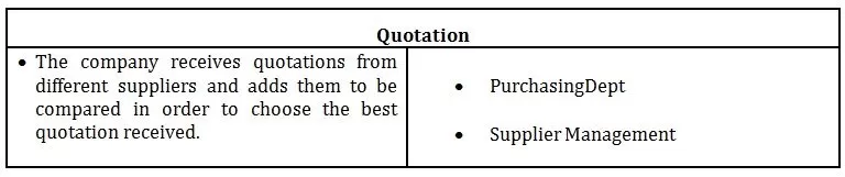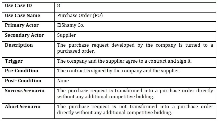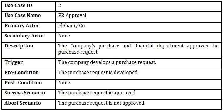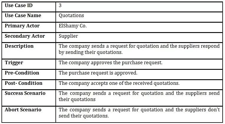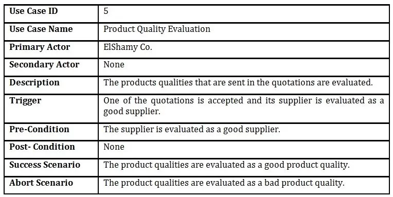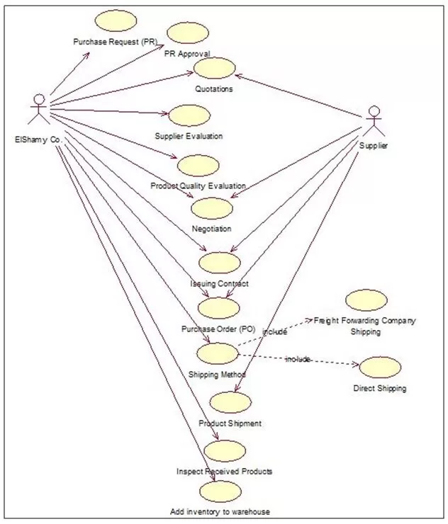 In figure (2), the use case of the supply chain of ElShamy Company is developed from the data given in the interview; it explains the current performance of thesupply chain, where the company develops its purchase request and sends it to the purchasing and the financial departments. When the two departments approve the purchase request, they send to the suppliers a request for quotations, and then the suppliers send their quotations to the company, then the company evaluates the respondent suppliers and their product qualities.