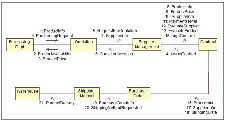 A collaboration diagram is also called a communication diagram or an interaction diagram. It is an illustration of the relationships and interactions among software objects in the Unified Modeling Language (UML). A collaboration diagram describes the interactions among objects in terms of sequenced messages. Collaboration diagrams represent a combination of information taken from class, sequence, and use case diagrams describing both the static structure and the dynamic behavior of a system. Although collaboration diagram shows same information as sequence diagram but they differ in their focus as the collaboration diagram emphasizes the organization of objects while the sequence diagram emphasizes the time ordering of messages (Sarma and Mall, 2007).
