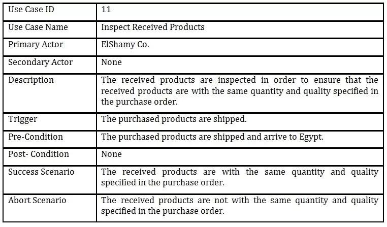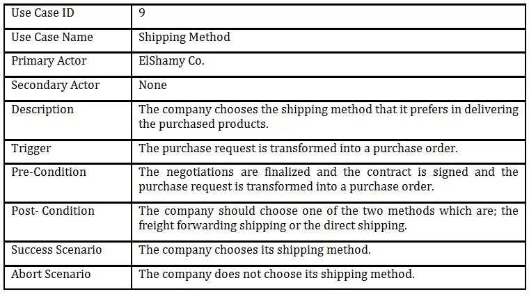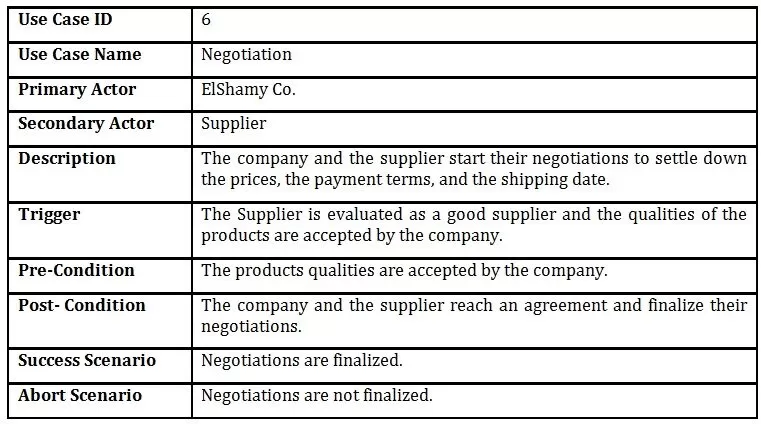 In this section the current supply chain of ElShamy Company, an SME that works in the trading process is analyzed using the Unified Modeling Language from the data that weregiven in the interview. The chapter starts by defining the UML diagram; starting with the use case diagram and the use case statements, followed by the class diagram and Class, Responsibilities, and Collaborators cards (CRC), followed by the collaboration diagram, sequence diagram, the activity diagram, and the state chart diagram.