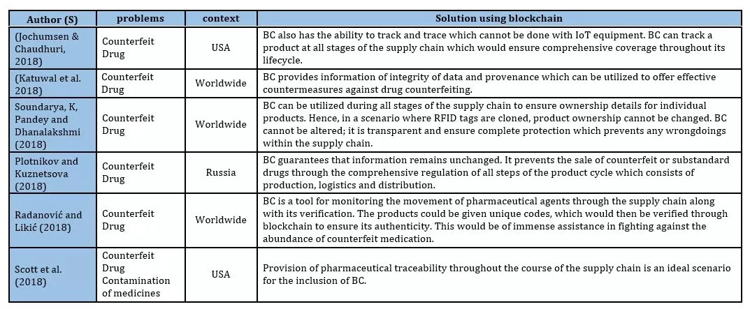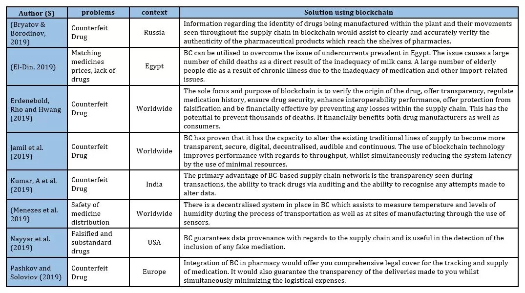 The current pharmaceutical supply chain system is complex (Katuwal et al. 2018; Schöner et al. 2017; Suhail, Pandey & Hong, 2019) and outdated (Haq & Esuka, 2018; Shrikant, 2019); it does not allow producers and regulatory authorities’ visibility and influence over the delivery of drugs, and it cannot overcome the challenge of cybersecurity in the 21st century (Shrikant, 2019). In addition, many health systems and hospitals have difficulties in achieving a high level of service as they have not addressed how to manage, supply, and use medicines to save lives and improve health (Nabelsi & Gagnon, 2017; Uthayakumar & Priyan, 2013).
