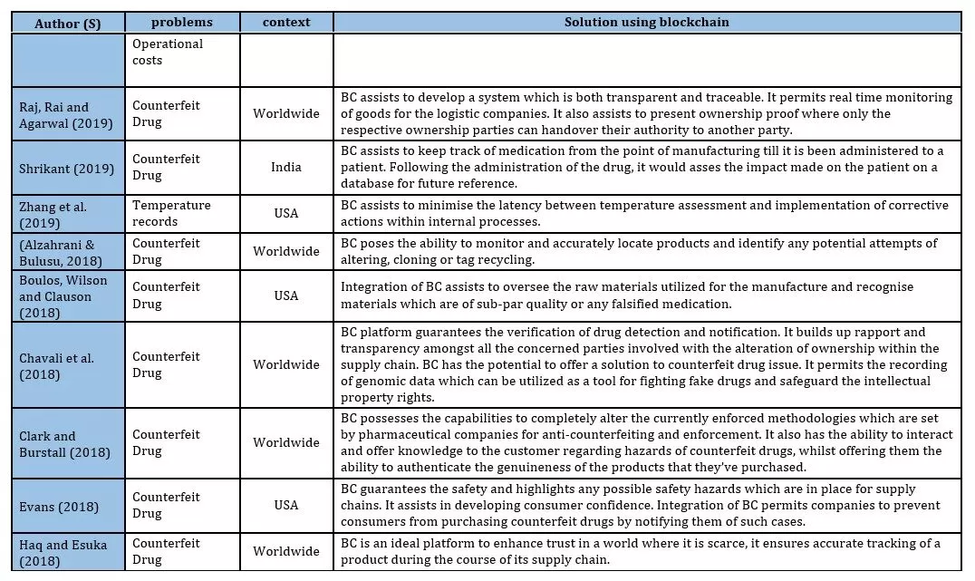 Previous studies have also focused on the safety of medicine distribution, lack of drugs, matching medicines’ prices in the market, and accessibility to the standard recorded temperature, which are summarised in Table 2.1. In fact, blockchain may be an ideal technology to improve performance and reduce the risk of the above-mentioned issues (Kurki, 2016; Siyal et al. 2019). However, there is a lack of studies regarding the influence of blockchain on the sustainability of the pharmaceutical supply chain. Therefore, considering this research gap and the overall scarcity of blockchain research, this study explores the role of blockchain in pharmaceutical supply chain sustainability.