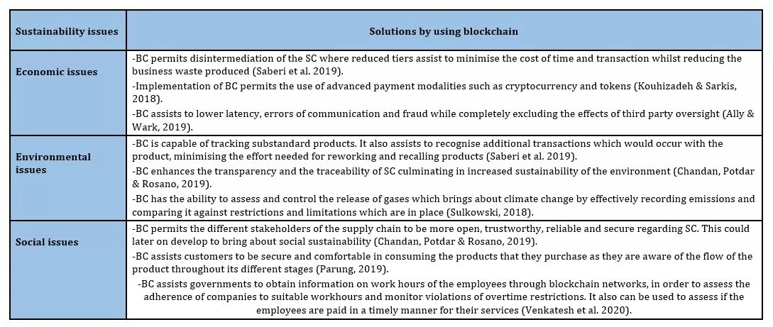 Table 2.2: Current issues in the supply chain concerning sustainability dimensions and how blockchain can solve these issues.