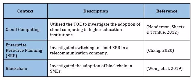 TOE framework has been adopted in many studies in the context of blockchain (Clohessy, Acton & Rogers, 2019). TOE has also been adopted by information technologies in general. Table 2.3 shows some of the studies that have adopted the TOE.