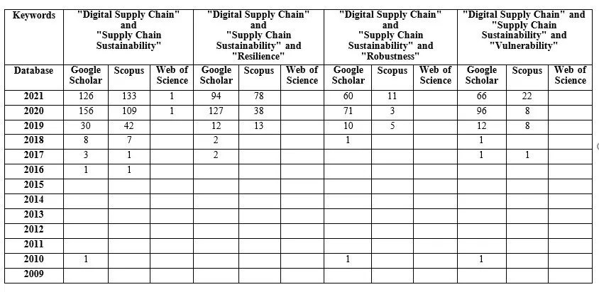 The sample consists of three tables derived from the databases Google Scholar, Scopus, and Web of Science with the keywords >>“Supply Chain Sustainability“<< and >>“Green Supply Chain“<<. Data was taken for the full text (table 1). from the beginning of July 2021. Due to the minor differences in search results found (+/- 10 papers), a further extension of the keyword query of >>“Supply Chain Sustainability“<< >>”Supply Chain Sustainability” and (“Regionalisation” OR “Slowbalisation” OR “deglobalisation”)<< did not bring any further knowledge and was neglected for further analysis. The same was also derived for the relation of the queries >>“Green Supply Chain“<< and >>” Green Supply Chain” and (“Regionalisation” OR “Slowbalisation” OR “deglobalisation”)<<.