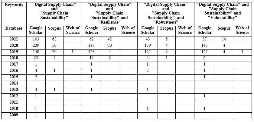 For the third research hypothesis, the ANOVA test was conducted in order to have a look on additional keywords, namely >>“Vulnerability“<<, >>“Resilience“<< and >>“Robustness“<< as SCRM-related terms in combination with further keywords, such as >>“Supply Chain Sustainability“<< or >>“Green Supply Chain“. As digital supply chains accompany real supply chains with a digital twin and are of ever rising importance for supply chains with regard to industry 4.0 and the required real-time data exchange. The corresponding frequency tables may be found in appendix A, table 7 and table 8. The outcome of the ANOVA test are presented in table 5 and table 6. Table 5 and table 6 evaluate only numbers from Scopus and Google Scholar. Due to the small numbers of publications in Web of Science, these numbers cannot be used for statistical analysis.