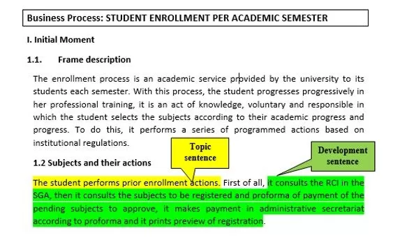 Initial moment. It is the writing of the business process, perceived by the senses and the knowledge generated in the mental space of the student, which must be processed in a logical way, with the conception of statements and written under the structure of the sentence. First, a framework description of the business process is made and then sentences are detailed as the subjects appear, in the environment of the main actions that they carry out called Thematic sentence (Tavera, 2016) and later the secondary or extension actions called Development sentences (Tavera, 2016), which are the details of the topic sentence, a description that is shown in Fig 1