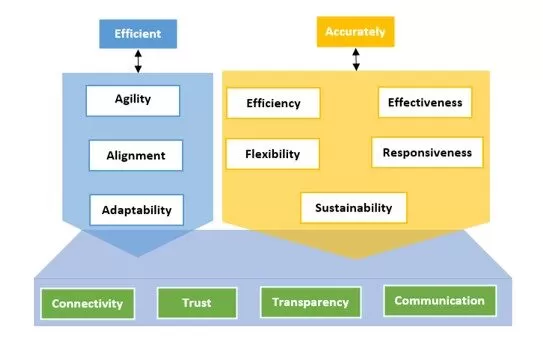 SCM analytics has been presented as an effective method to analyze, disseminate, collect and use Big Data information. Effectiveness, efficiency, responsiveness, flexibility, and sustainability are the main five dimensions to measure accurately [6]. The key characteristics of an efficient SCM are: agility, alignment, and adaptability [7]. Assuring connectivity, trust, transparency, and communication within an SCM is challenging [8] and may lead to a dramatic effect on SCM flexibility, sustainability, and resilience, along with other vital characteristics. Flexibility is the measure of control and adaptability of an SCM against changes in market demand. Agility can react to such unexpected situations quickly and maintain efficiency, availability, and capability. Resilience delivers a comprehensive perspective on the SCM performance, which is described as its capability to maintain sustainable behavior when exposed to disruptive events [9]. (See Fig. 1.)