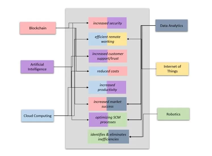 Increased security of the SCM is better achieved with Blockchain and AI, while Cloud Computing and IoT are helping the SCM to be more efficient while employees can work remotely. With Data Analytics and Robotics that are identifying and eliminating the inefficiency, the processes are more optimized. Cloud Computing and AI technologies increase productivity, and with Blockchain technology, the overall costs are reduced. Data Analytics, Blockchain, and AI are increasing customer support and trust and are increasing the market success. (See Figure 10.)
