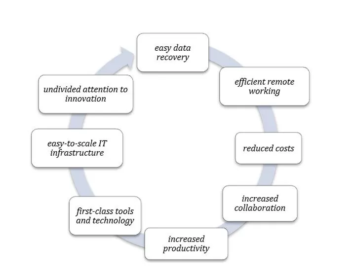 Some examples on how Cloud Computing increases efficiency are: easy data recovery (data and information records that are stored in the cloud, are easier to retrieve – compared to when they are stored at a local level and avoid expensive means of data recovery); efficient remote working (provides flexibility to workforce, employees can access and share files and documents anywhere at any time); reduced hardware, software and operational costs (can help the SCM to cut the cost of purchasing, maintaining and upgrading IT equipment and systems, save operational costs and reduce the level of IT expertise); increased collaboration and productivity (teams efficiently collaborate and execute tasks faster, chat and work with colleagues, can access and work simultaneously on documents); first-class tools and technology (can provide access to the latest technology); easy-to-scale IT infrastructure (quickly scale the IT requirements when required, and adapt with cloud computing); improved accessibility (provides access anytime, anywhere); undivided attention to innovation (can provide an environment for innovation and brings effectiveness and efficiency, because the innovation provides a competitive edge and helps to outperform the competition). (See Fig 2.)