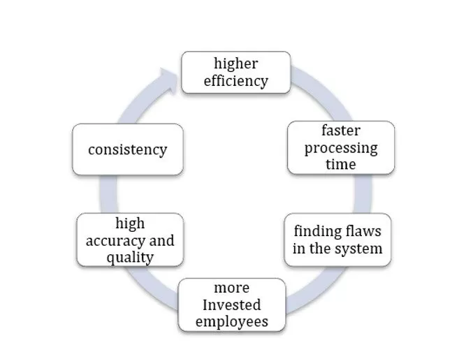 With so much pressure on finding a way to drive efficiency, SCM is applied to Robotic Process Automation (RPA) to help them achieve efficiency. By adopting RPA, SCM can enhance efficiency, minimize operational costs, improve quality, and allow the automation of business processes. Because RPA can work 24 hours out of seven days a week, it is increasing production and accuracy by dropping cycle times and decreasing the need for ongoing training, can work with structured and semi-structured data efficiently, offering the best results in each execution. RPA can raise the efficiency and decrease costs; some examples of how RPA increases efficiency are [14]: higher efficiency, faster processing time, finding flaws in the system (collection of data on every process and reports them as key analytics), more invested employees, high accuracy and quality, consistency (all tedious and repetitive tasks and processes can be automated which helps to eliminate the risk of human error). (See Fig 4.)