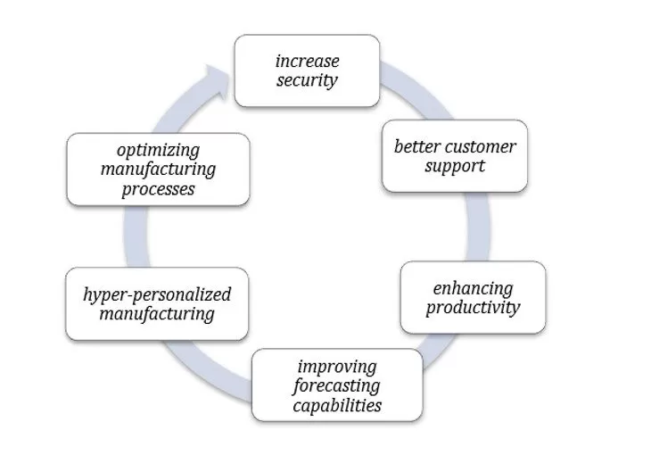 Some examples of how Artificial Intelligence increases efficiency are: increased security (enhanced protective and secured measures in the network of the business, detecting anomalies); better customer support (technology is reducing the cost by hiring fewer customer service agents); enhancing productivity (automating tasks such as data entry, accounting and payroll administration, and access all the necessary customer data quickly to improve the efficiency and reduce errors); improving forecasting capabilities (detects seasonality and makes references about increasing and decreasing levels of production); hyper-personalized manufacturing (products and services that are highly relevant to individual consumers); optimizing manufacturing processes (monitor the quantities used, cycle times, temperatures, lead times, errors, and downtime to optimize production runs). (See Figure 6)