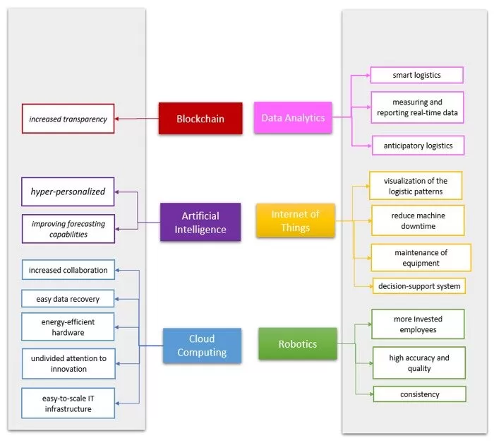 Blockchain technology will be possible to provide a secure, transparent, and trusted digital transaction platform. AI can increase efficiency, as it provides hyper-personalized services and products and is improving the forecast capabilities. Cloud Computing technology has a significant impact on SCM processes optimization. It can increase the collaboration between networks; it is an easy tool for data recovery, is energy efficient, and has an easy-to-scale IT infrastructure; this Cloud Computing opens the doors for many innovations in SCM. Data Analytics transforms traditional logistics into smart logistics and has the power to make anticipations while measuring and reporting data in real-time. IoT is helping the SCM to increase operational efficiency, and the factory machine downtime is reduced while providing a decision support system. Robotics or Robotic Process Automation has significantly improved the productivity in SCM; this technology is impacting the employees, and they are capable of being more invested in work activities; besides this, RPA has high accuracy, quality, and consistency. (See Figure 9)
