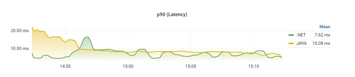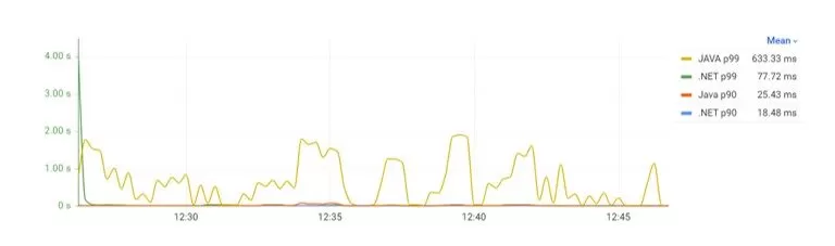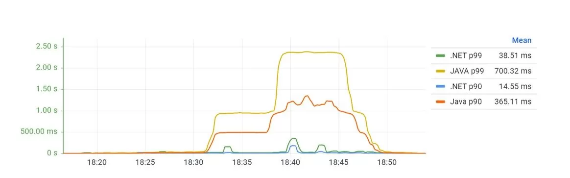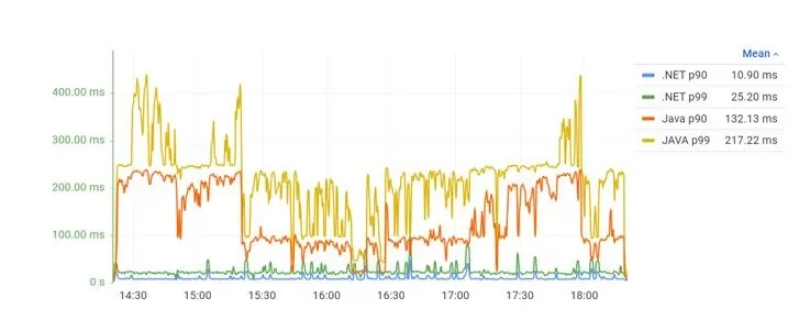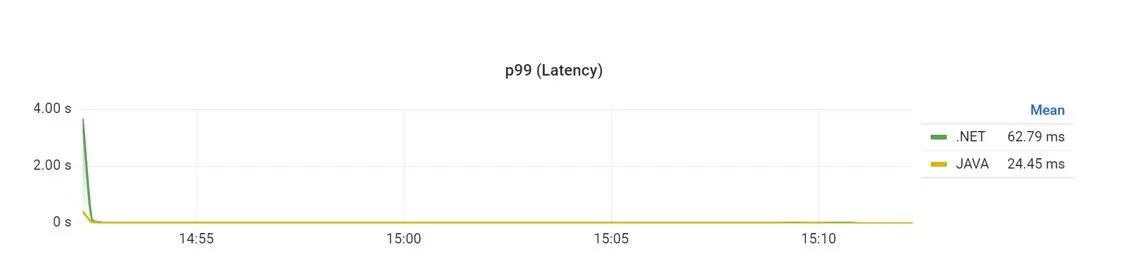 The first three requests to the .NET API are always extremely slow compared to any other during the 20-minutes request. The test was restarted several times to verify this behavior. The 99% percentile provides a better image of the response time over time. But the results with the demeanor on the first requests could mislead the reading of the results chart (Figure 9).