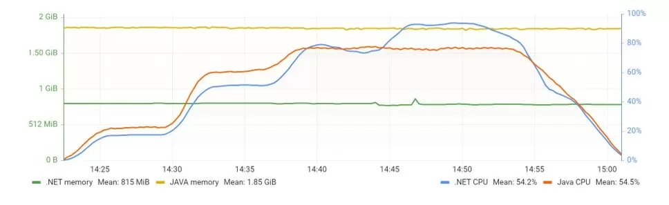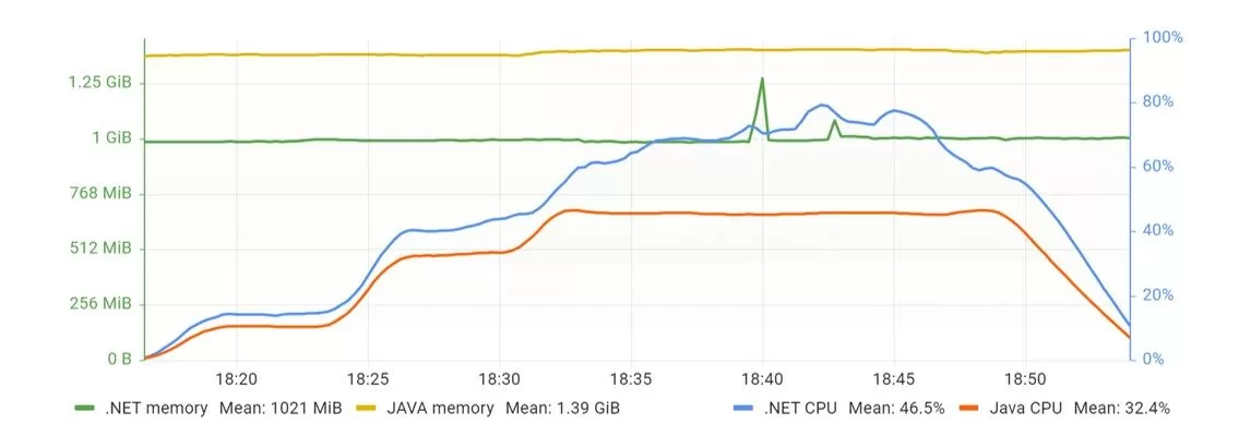 The load test to the API used the K6 tool. It is a 20 minutes test, starting from 0 VUs to 100 in 5 minutes, keeping the 100 VUs for 10 minutes, and then 5 minutes to cool down until 0. The memory requirements had grown constantly on both APIs, where the Java API also kept requiring from 30 to 40% more RAM (Figure 8). The opposite happens with CPU requirements. Here, .NET API is more demanding, requiring less than 5% over Java API.