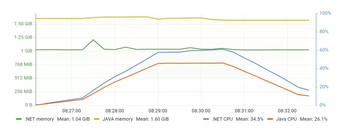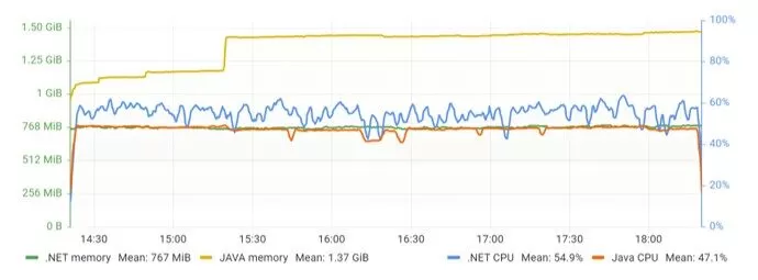 Upon reviewing the results of the soak test, it is evident that both APIs demonstrated consistency throughout the test. However, the .NET API required 40% less RAM but had a higher CPU requirement of 90%, as illustrated in Figure 31. It is worth noting that the behavior of the .NET API differed from the other tests, with a fluctuating CPU chart line throughout the test, although the range was not significant.