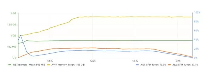 Looking at the results of the soak test, again both APIs were consistent through the test. On this test, .NET clearly performed better than Java API, requiring 17,5% less RAM and 57% of the CPU requirements, as shown in Figure 23.