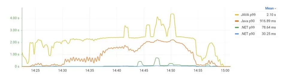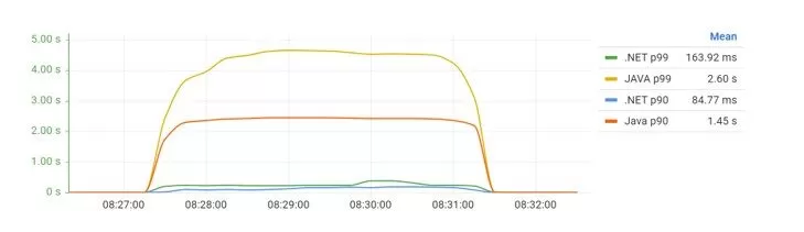 The response times of the .NET API were constant and stable across the test. On the side, the Java API response times were over eight seconds, which indicated some problems when compared with the averages of 32 and 42 milliseconds of the .NET API on the percentiles 90th and 99th, as seen in Figure 40.