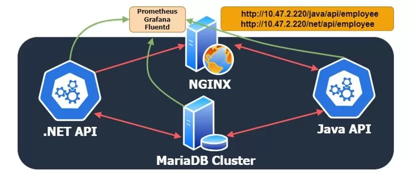 On the head node, Nginx was installed to act as a reserve proxy solution to access the API’s. It was installed and configured on the same node as Prometheus, Grafana, and Fluentd. On the second node was installed .NET 6 SDK, and the .NET API was compiled and set up as a service. Finally, Java SDK was installed on the third node, and the Java API was configured as a service, similar to the process on the other API node. For the database connections and to provide a real-life scenario, there were used the existing clusters with MariaDB and Microsoft SQL Server (Figure 4).