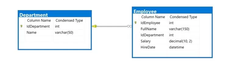 The database used for this work contains two tables. The first is the data about the entity Department and the other about the Employee. The Employee table has a foreign key that refers to the primary Id of the Department, shown in Figure 5. The design for this database was that a request to the API employees would require the department name.