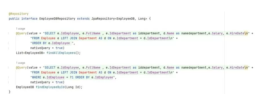 Developing the two Web APIs to work with the same database was challenging. Using ORMs improves productivity, but the developers lose some control over the queries to the databases. The way to ensure that both APIs made the same requests was to force the Java API to use the same queries that the .NET has done. The .NET API running on debug prints out the queries to the console. That query was then used on the JPA repository implementation on Java, as shown in Figure 6.