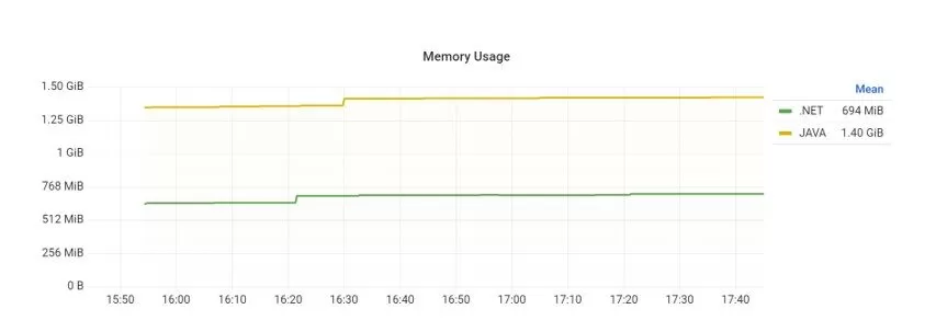 Before running the initial tests on section API performance tests, the first results were obtained via Grafana while the nodes ran idle without requests. Within the first hours observed in Figure 7, the Java node required more than double the RAM compared with the .NET node.