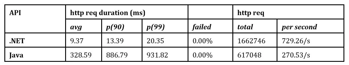 Table 10 confirmed the results that indicate the .NET API under-performed on this test. Both APIs haven’t failed HTTP requests.