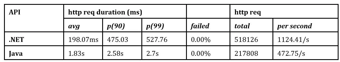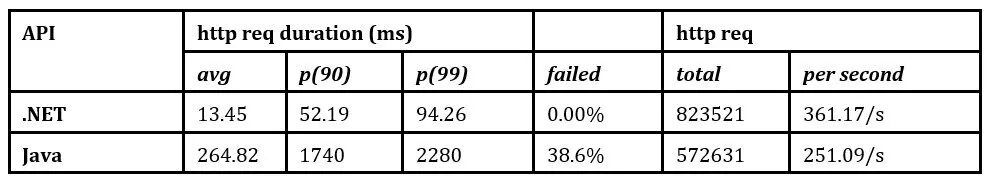 Under medium to heavy loads, the Java API exhibited suboptimal performance, with response times escalating as the number of virtual users (VUs) increased. Regarding resource utilization, the .NET API demanded more CPU power, whereas the Java API consumed a higher proportion of memory, indicating greater resource consumption.