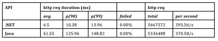 Table 11 confirms that the .NET API performed significantly better than the Java API, particularly at the 90th percentile. Both APIs had no HTTP request errors.