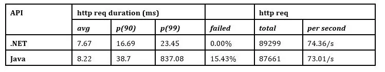 The report from the command line was critical to understand that both APIs had problems processing the requests, as shown in Table 14. Still, there is a 33% gap between both APIs, where the Java API reaches almost 78% of the failed requests.