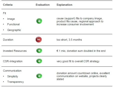 The campaign should, moreover, be part of a company’s CSR concept (factor 4 CSR integration). Campaigns which are integrated in an overall CSR approach have, according to CSR Europe (2000, p. 20), been found to achieve a high level of credibility and differentiation.