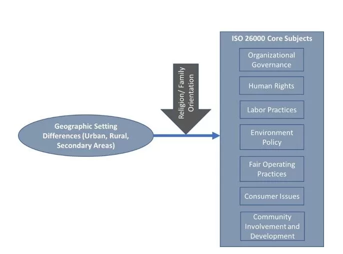 The ISO 26000 framework’s main objective was to manage the responsibilities of companies towards their societies in different areas mainly in labour practices, human rights, fair operating practices, environment, involvement and development, organisational governance and consumer issues (Bowens, 2011; Zinenko et al., 2015).