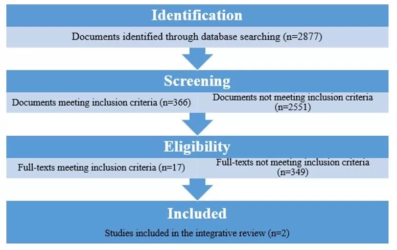In the final Included phase, the 17 articles were read fully entirely to find out which were aligned with the inclusion and exclusion criteria. From this, 15 were removed as not meeting the inclusion/exclusion criteria. This resulted in only 2 articles that met all inclusion/exclusion criteria.
