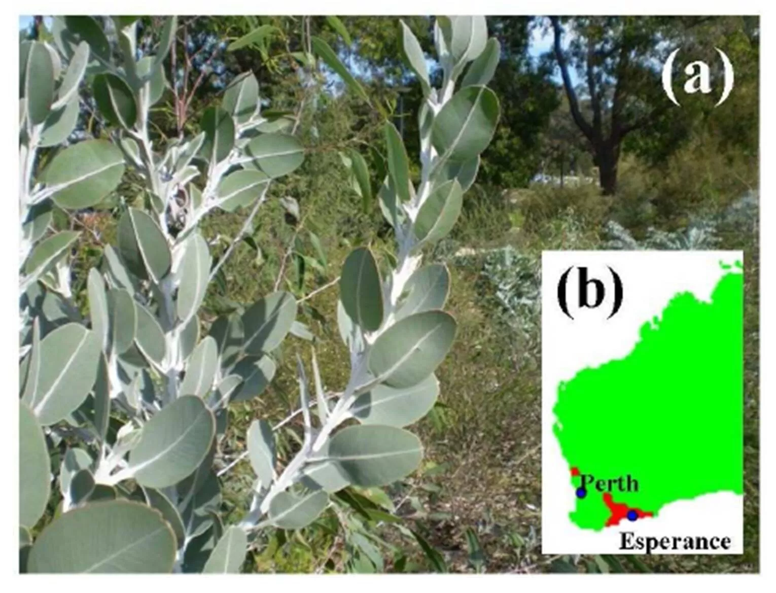 Figure 1: (a) Eucalyptus pleurocarpa (Tallerack) a plant native to South Western Australian (b) Regional locations of the Tallerack