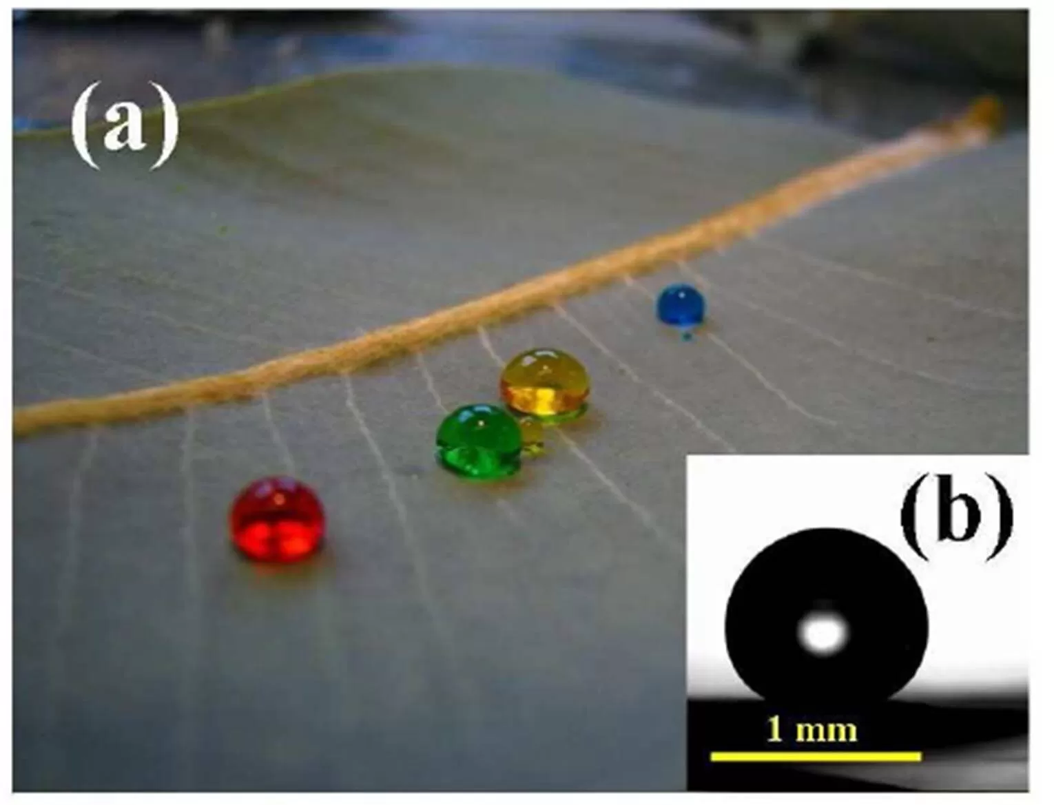 Figure 2: (a) Dye-coloured water droplets, with high contact angle resting on a Tallerack leaf (b) Image of a sessile water drop used during contact angle measurements