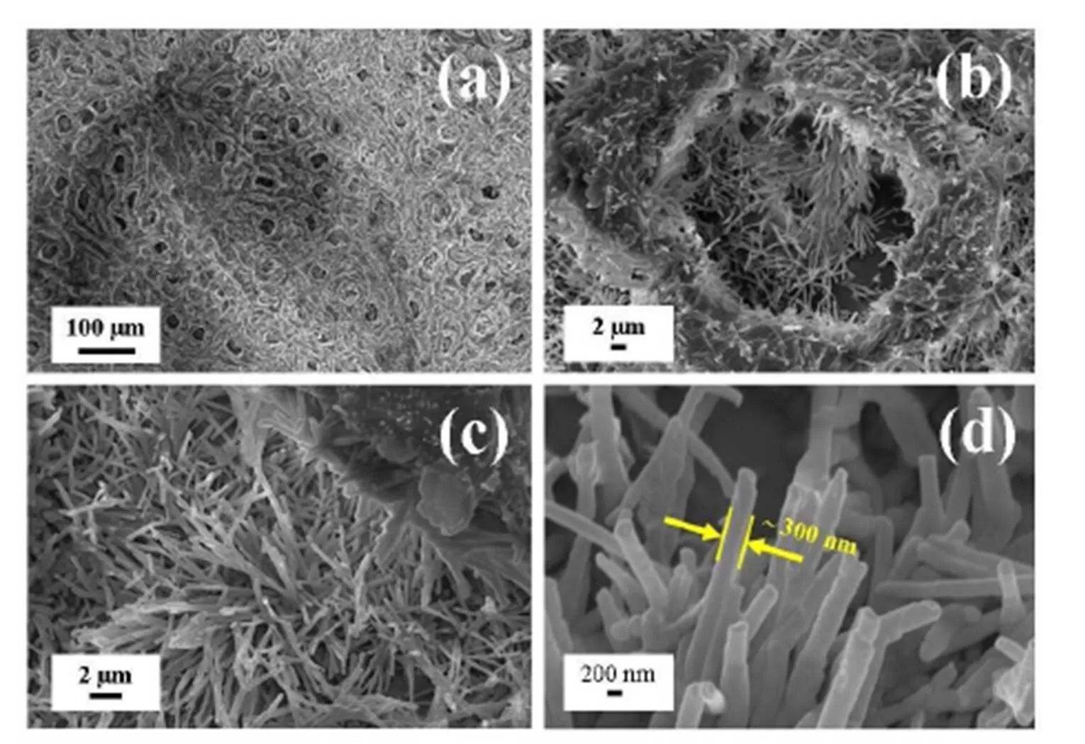 A similar FESEM survey of the abaxial leaf surface revealed a landscape dominated by stomata with diameters ranging from 20 to 40 µm and stomata spacing ranging from 70 to 100 µm as seen in Figure 4 (a). The stomata rims and surface bumps surrounding the stomata are more dominant than those found on the adaxial surface and range in size from 5 to 15 µm. But unlike the adaxial surface, the abaxial rims and surface bumps are lightly adorned with nanometre scale pillar structures as seen in Figures 4 (b) and (c). Examination of the nanometre scale pillars revealed that their mean diameter of 300 ± 70 nm was similar to the diameter measurements taken on the adaxial surface. However, measurements of the pillar lengths revealed a significance difference, with the abaxial pillar lengths ranging from 2 to 3 µm as seen in Figure 4 (c) and (d). Furthermore, there are fewer numbers of pillars present and there appears to be an increased amount of secondary growth which has produced a pronounced wavy-coral, fractal-like structure. It is the differences in the abaxial epicuticular wax formed pillar structures that produced a reduced a lower hydrophobic response compared to the adaxial surface. Therefore, the key factors for producing the super-hydrophobic adaxial leaf surface was the presence of longer pillar lengths, higher pillar densities and less secondary growth leading of the epicuticular waxes.