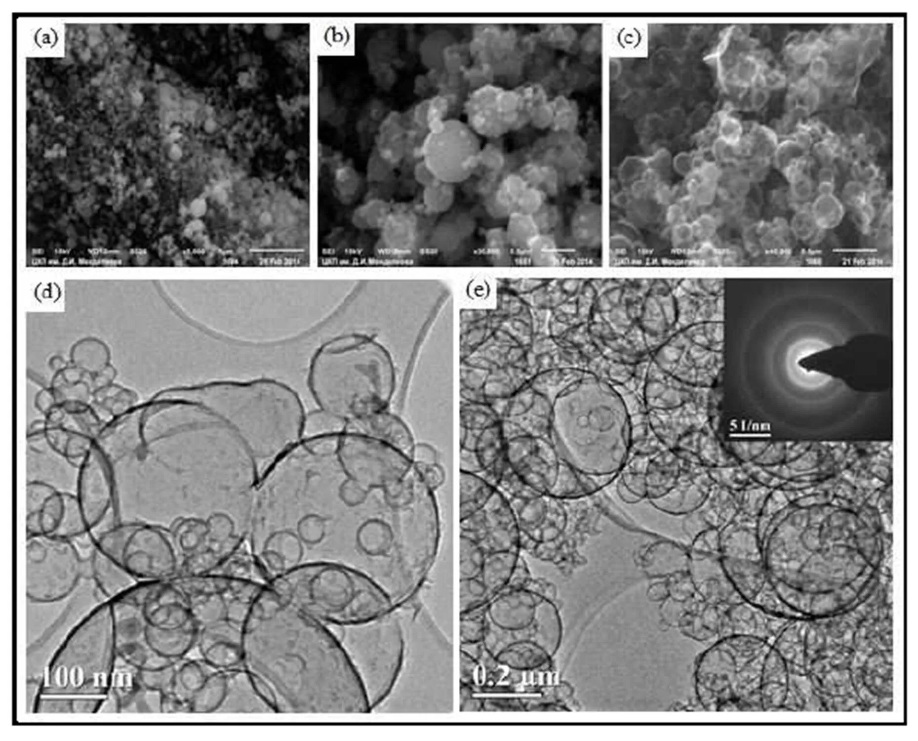 The carbon spherical shells with the thickness of some nanometers become not strong and do not keep their habitus. Therefore destroyed spheres are seen on some of the pictures (Fig 6 d), but its number is negligible. Coalescent particles are also observed.