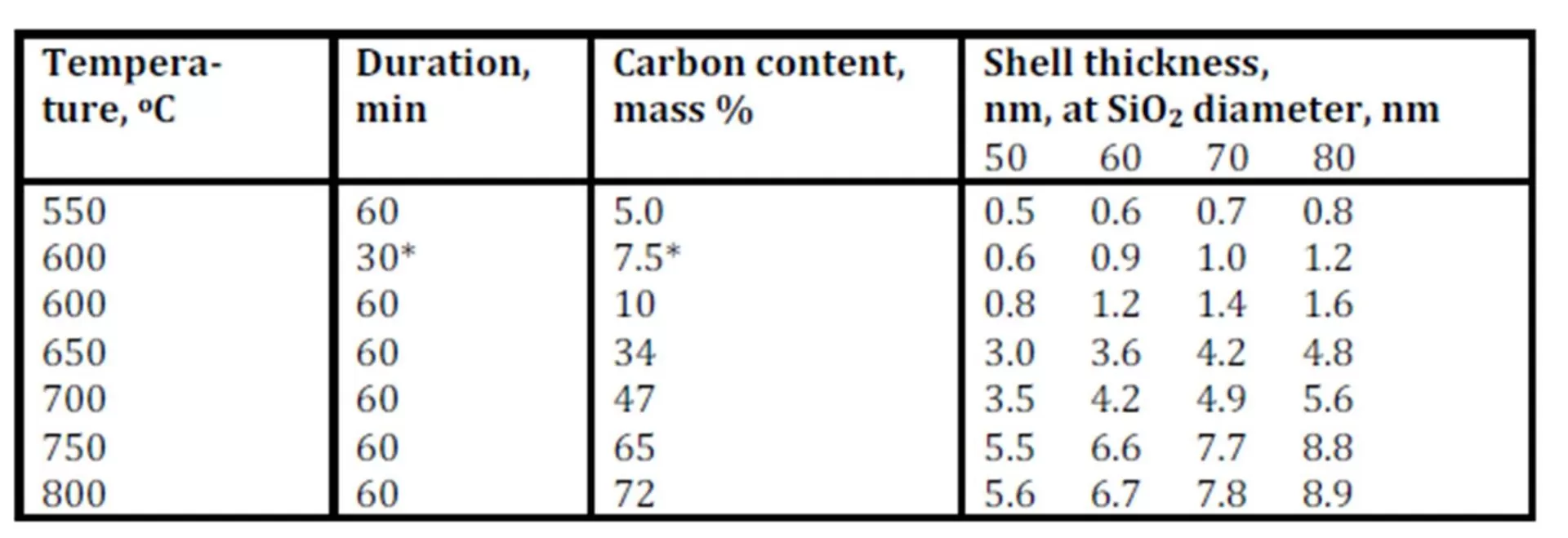 The lower is the pyrolysis temperature, the higher are porosity and specific surface values of shells. The specific surface of shells synthesized at 600 oC was 175 m2/g, whereas specific surface value of a matrix SiO2 particles was equal to 12—13 m2/g.