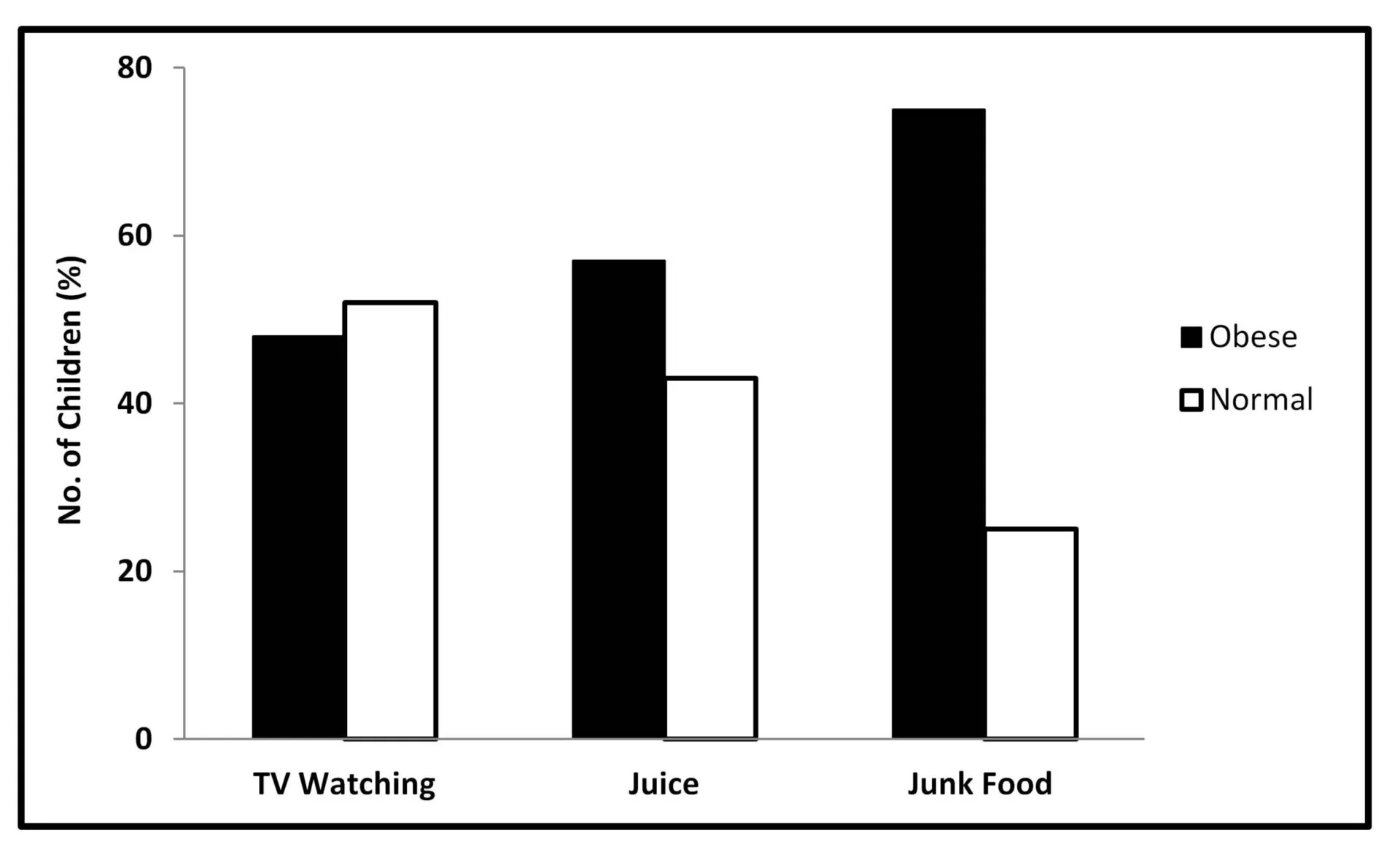 Among the respondents, 48% of obese children spent more than 3-4 hours daily in front of television while 52% of children of normal weight spent less than 2 hours only. Furthermore, obese children highly prefer different types of juice and junk food compared to normal children. From this chart (Fig. 2), we show that a there is clear correlation between TV watching/juice intake/fast food intake and obesity.
