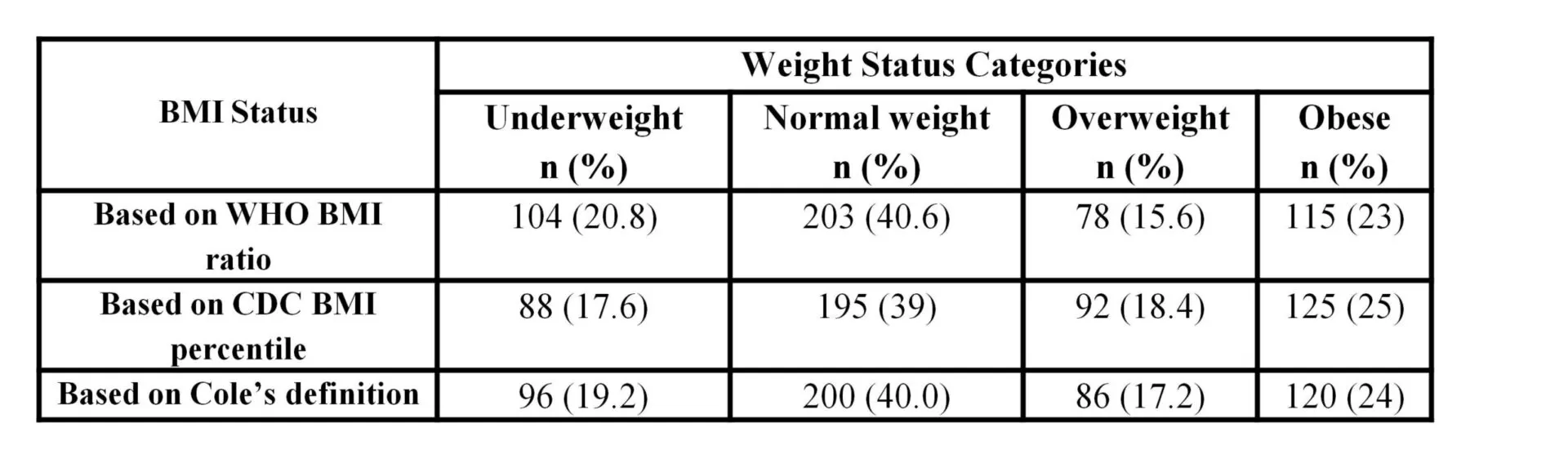 The WHO criteria for obesity based on the BMI guiding principle were used in this study. BMI is calculated as a way of weight in kilograms divided by height in meters squared (BMI = kg/m2). Using BMI chart, it is feasible to categorize the level of obesity by reference to internationally accepted ranges, beginning from underweight (BMI ˂ 18.5 kg/m2), normal (BMI 18.5-24.9 kg/m2), overweight (BMI 25.0-29.9 kg/m2) and obese (BMI ≥30.0 kg/m2) (Lima et al., 2000). In addition to this BMI chart, we redefined according to CDC BMI percentile growth chart (BMI for children and teens) and Cole established cut off points to define childhood overweight and obesity (Cole et al., 2000).